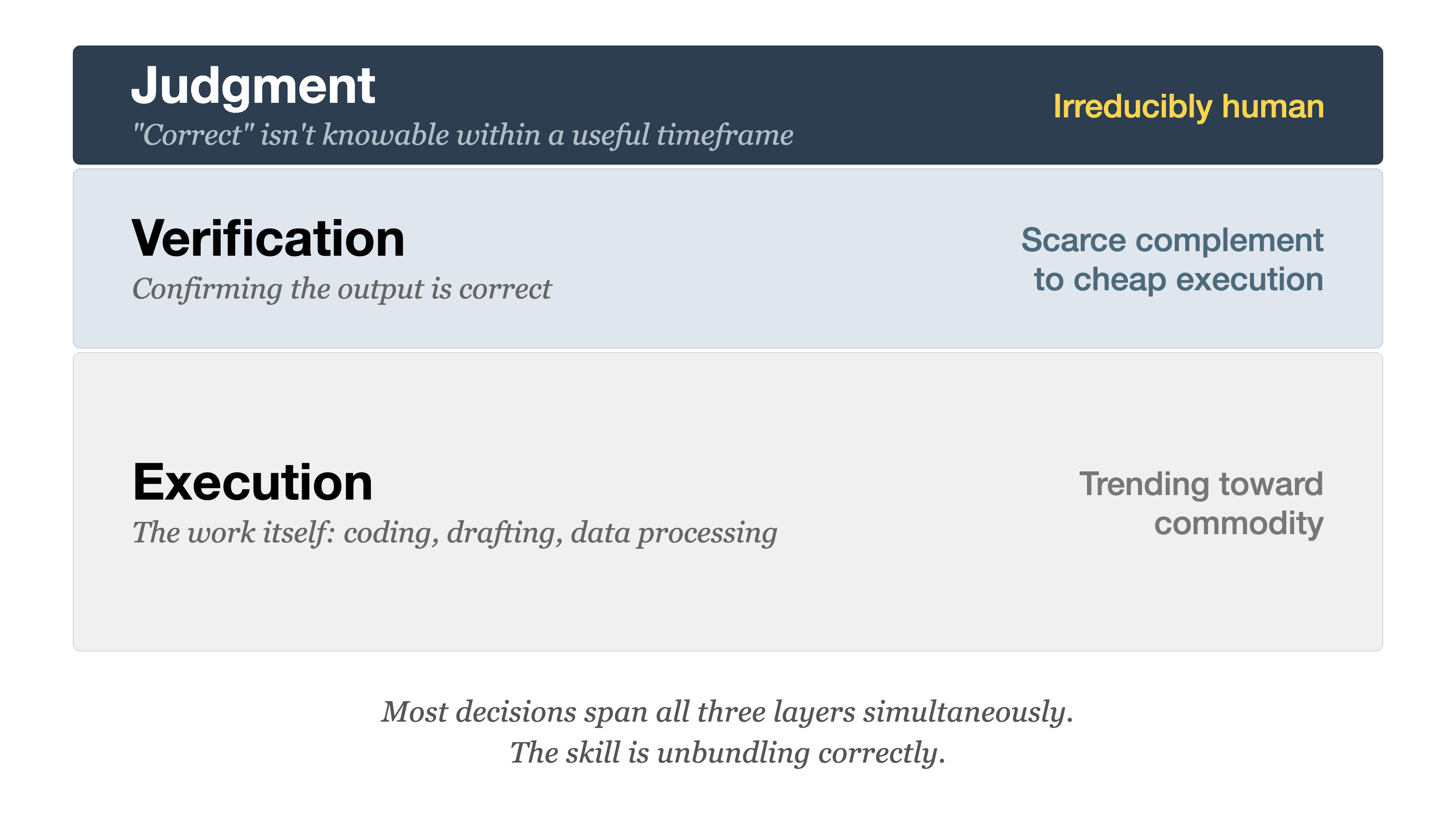 Most important decisions span all three layers simultaneously. A single investment decision involves execution (building the financial model), verification (checking the model against reality), and judgment (whether the market timing is right for this founder). The skill isn’t choosing which layer you’re in. It’s unbundling a decision into its components and treating each one appropriately.