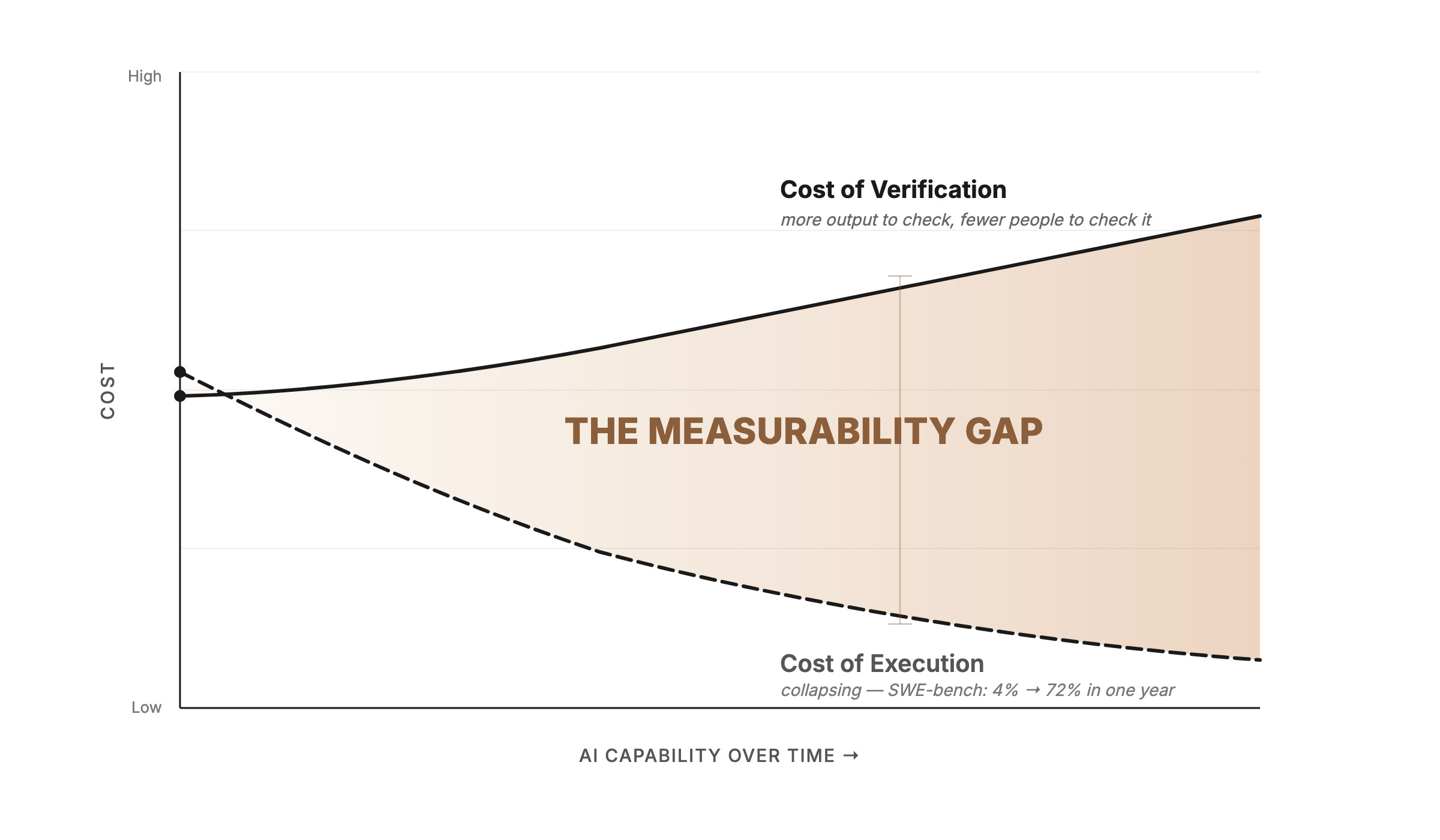 But the cost of executing work and the cost of verifying it are racing in opposite directions. AI execution is collapsing in cost — SWE-bench accuracy went from 4.4% to 71.7% in a single year. The cost of verifying AI’s output isn’t falling at the same rate. In many domains, it’s rising — because there’s more AI-generated output to verify, and fewer experienced humans to verify it.