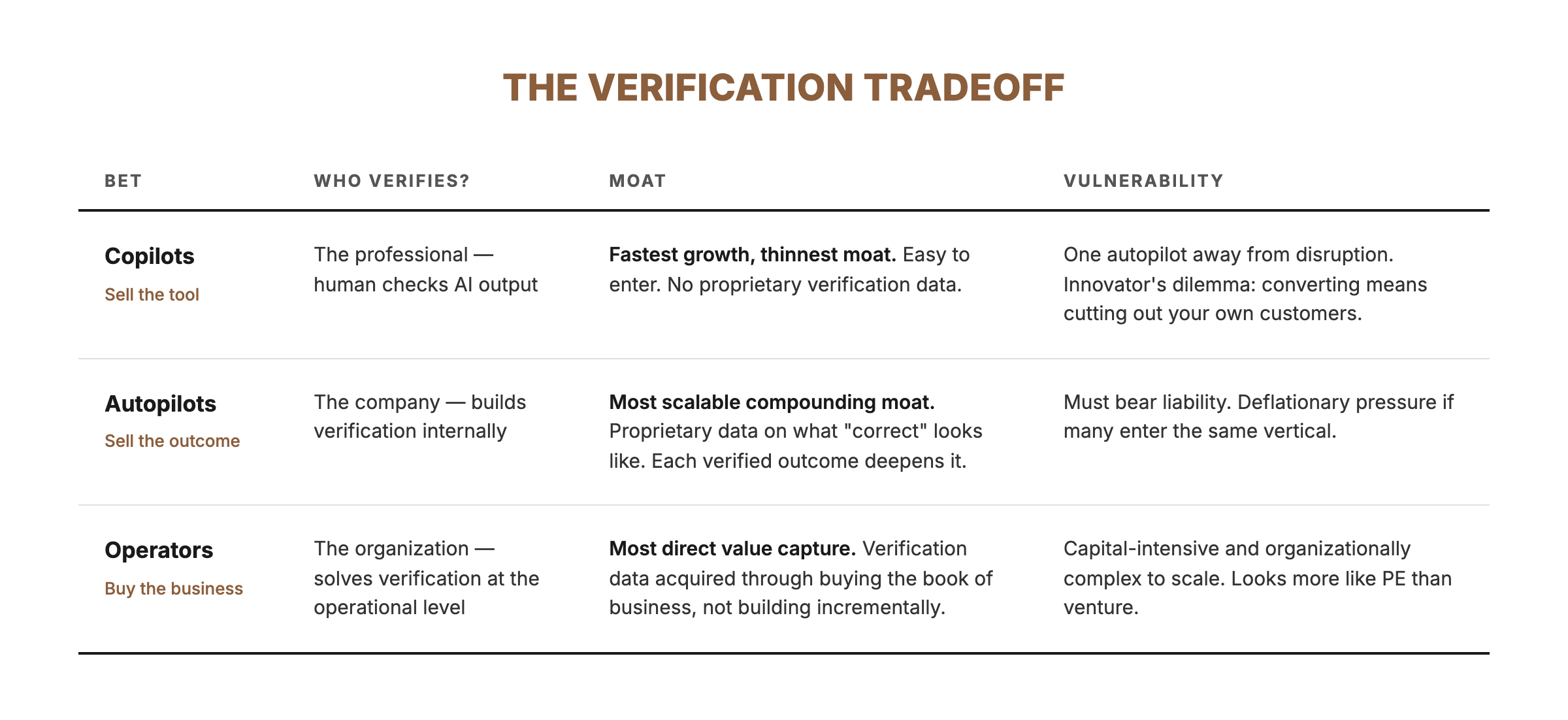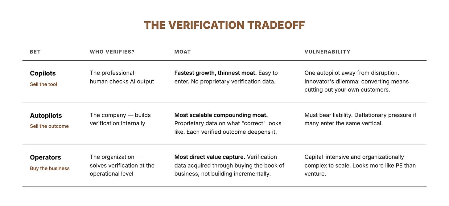 These aren’t rungs on a single ladder — they’re different bets on where in the verification chain you want to sit. The structural question is the same for all three: who verifies the output, and who bears the liability when it’s wrong? But the answer leads to fundamentally different businesses.